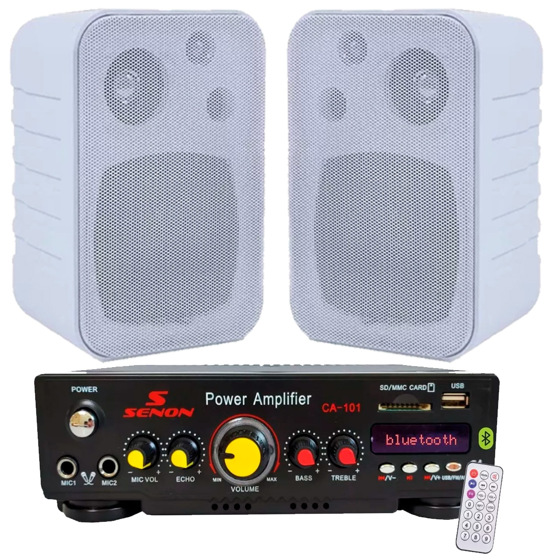 Potencia de 41w+41w. Estéreo. Con módulo reproductor USB/SD/BLUETOOTH/RADIO FM (con antena telescópica), Conexion inalambrica. Doble entrada de micrófono con efecto echo, dos entradas de línea, control de volumen y control de tono en el Master. Con control remoto. Alimentación 220V / DC 12V5A. Impedancia: 2-8 Ohms. Nº Certificado Seguridad Eléctrica: BVA/E/0653-22 Certificadora: Bureau Veritas Argentina S.A.